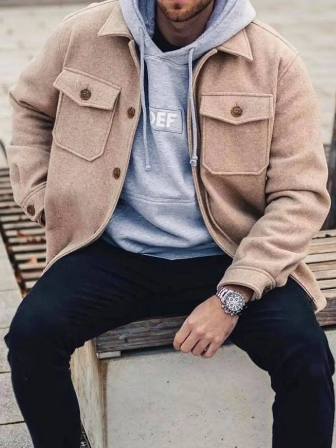 • Features: Oversized, Buttoned, Pocketed