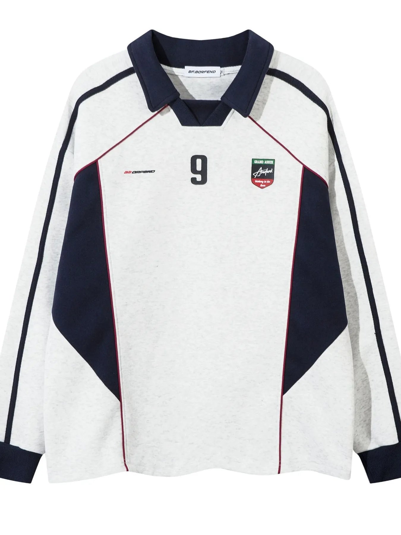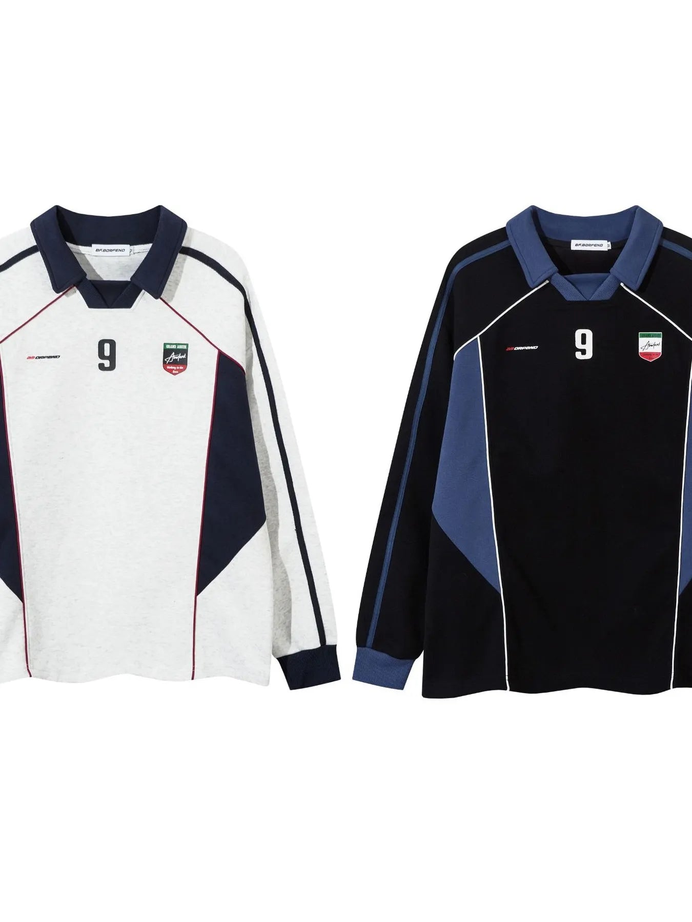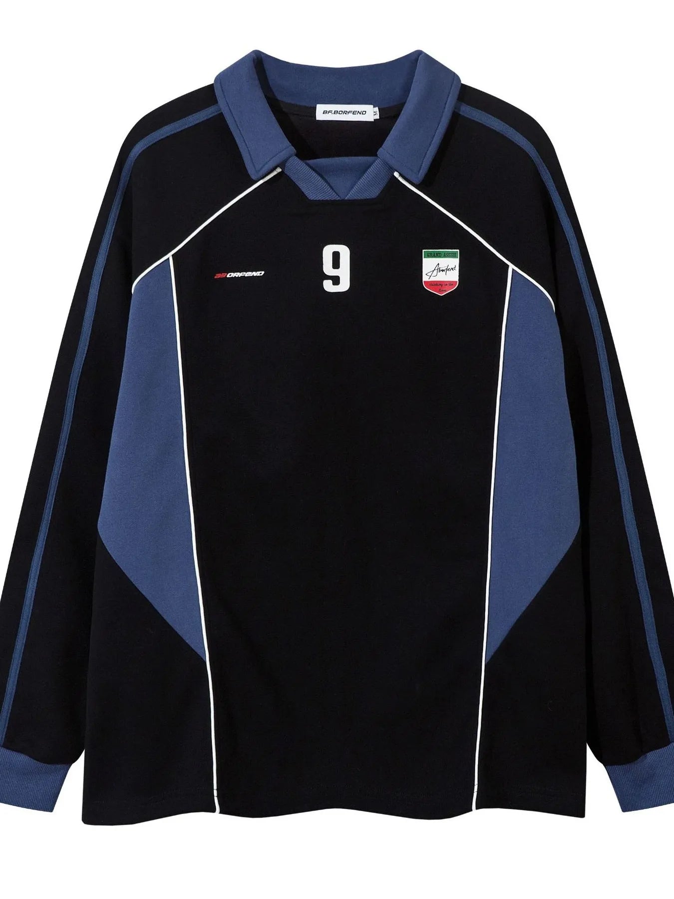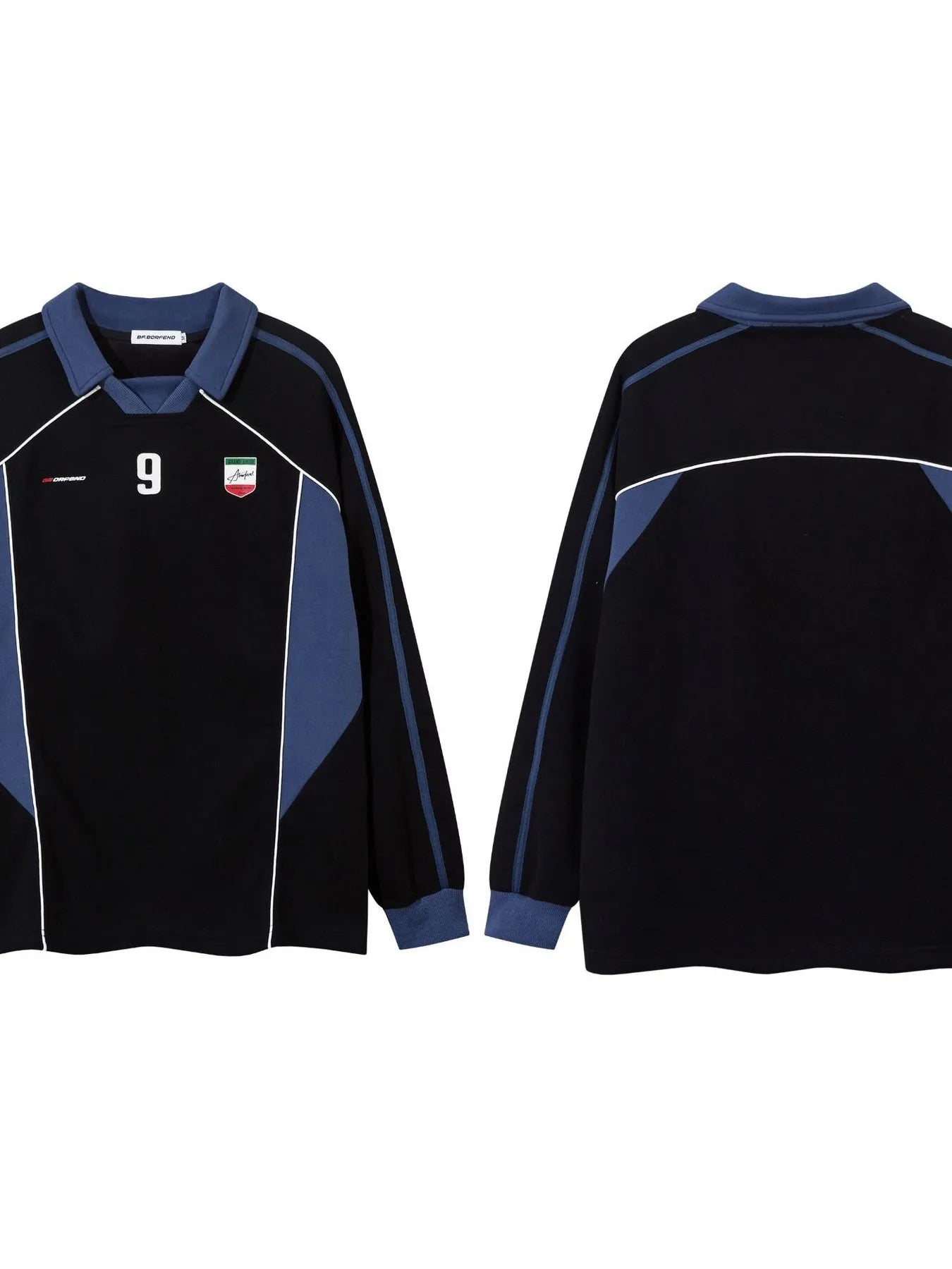 Men's Color Block Long Sleeve Polo with Number 9 Graphic